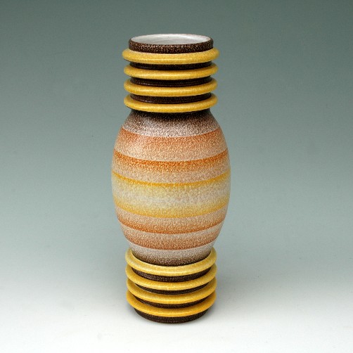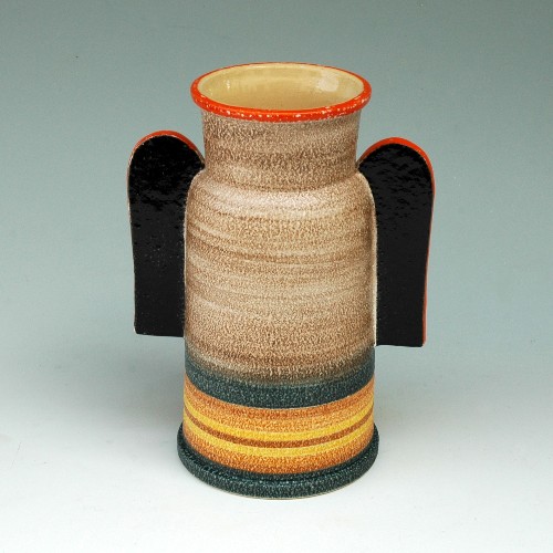 La seconda, successiva, di qualche anno, è terracotta maiolicata matt con effetto a buccia d'arancia, decorata con motivi geometrici a colori vivaci e sfumature.